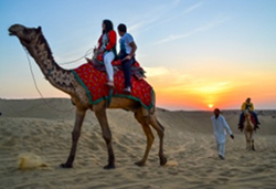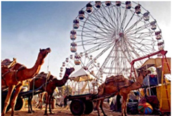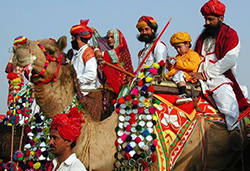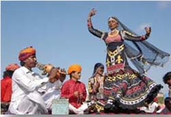 Camel Fair, Bikaner - A unique blend of color, rhythm and melody. The Camel Festival begins with a colourful procession of bedecked camels, Ships-Of-The-Desert, in the red sandstone backdrop of the Junagarh Fort. The festivity advances to the open sandspreads of the Polo Grounds, followed by camel races, camel milking, fur cutting design, the best breed competition, camel acrobatics, camel bands and watching all this, are the gaping spectators. The camel display amazing foot-work, dancing gracefully to the slightest direction of their riders. Colourful bridles, bejewelled necks, jingling anklets and long, lanky camel shadows on dusky sands, cast a magic spell. The jubilant, skirt-swirling Gair dancers, the awe inspiring Fire dance, and dazzling fire-works light up the fortified desert city of Bikaner.
