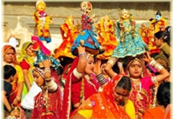Gangaur Festival - The most important local festival in Rajasthan, Gangaur is held about a fortnight after Holi and the celebrations go on for eighteen days. The festival is held in honor of Gauri, a manifestation of goddess Parvati, the wife of Lord Shiva. The festival is celebrated by girls and married women throughout Rajasthan. Images of Gauri are ornamented and offerings are made. This is also an auspicious time for young people to select their life partners. Colorful processions with the town band, horses, and elaborate palanquins make it a fascinating spectacle. The Gangaur festival is celebrated throughout Rajasthan with great enthusiasm but the celebrations in Jaipur and Udaipur have their own special charm. The festival is also celebrated with great pomp and show in Bikaner, Jodhpur, Marathwara and Jaisalmer. Girls worship the goddess throughout the fortnight. Colorful images of Gauri, beautifully dressed and bejeweled, are taken out in a procession accompanied by the town band. A boat procession is taken out on the Pichola Lake in Udaipur. Women balancing several brass pitchers on their heads add to the gaiety of the Udaipur celebrations. Thousands of people from the countryside come to take part in the procession of Gangaur, which goes around from village to village. Tribal men and women get the opportunity to meet and interact freely and during this time, they select partners and elope to marry. An unusual, romantic custom sanctioned by the community.